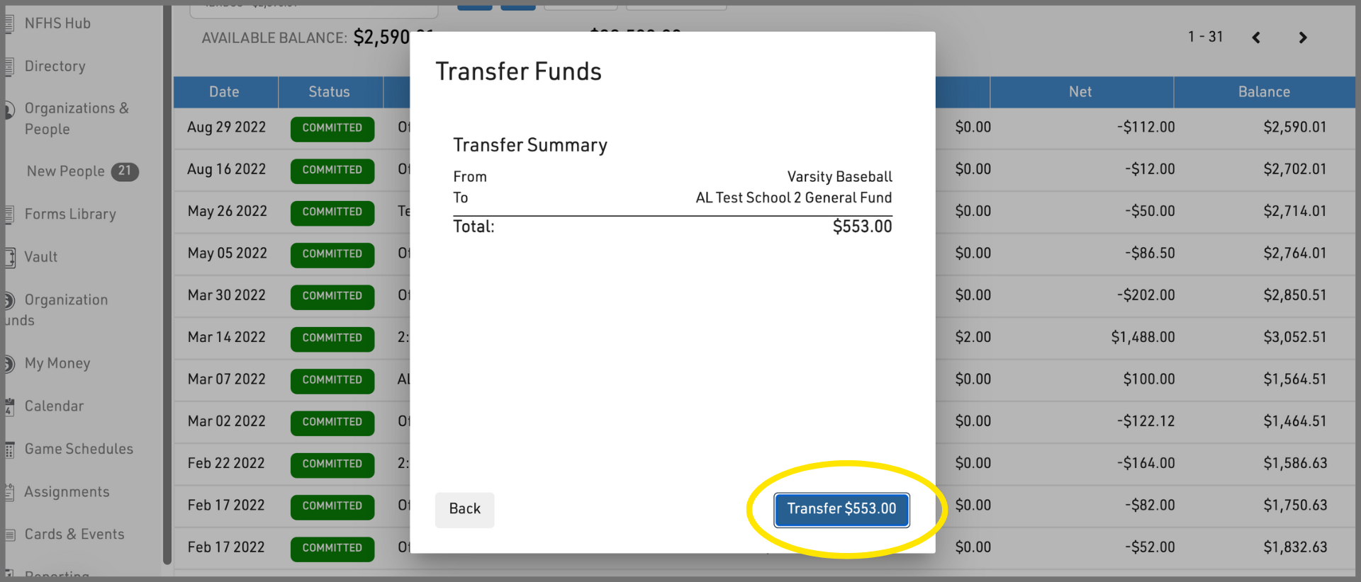 14. To add money to your cash account (for paying officials/game workers or invoices to your state association), select the 'Transfer Funds' button at the top of the screen. Complete the fields to transfer money from your organization's bank account to your cash account. This ACH transfer will take 2-3 business days to complete.