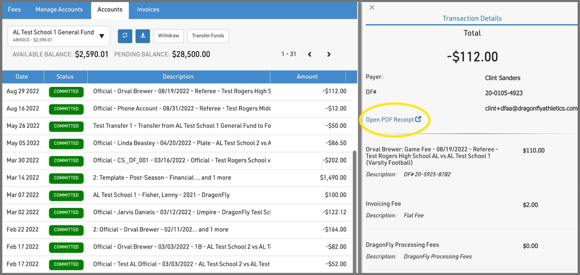 12. Your cash account with its available balance will appear. You will also see a list of transactions and can click on a transaction to view details in the right-side panel, including a link where you can view a PDF receipt.