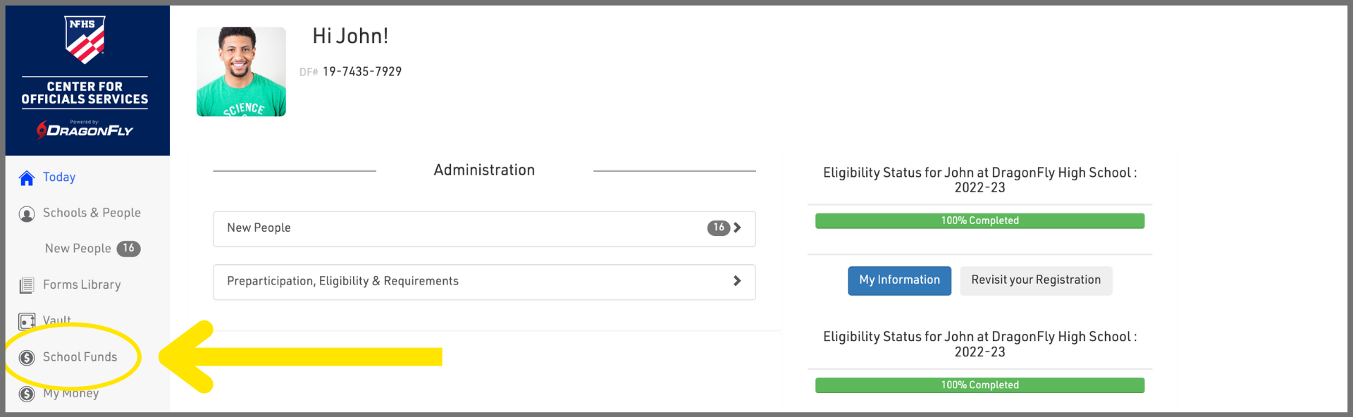 1. To create a new cash account for your organization, log in to DragonFly on your computer's web browser and select either 'School Funds' or 'Organization Funds' from the left-side menu.