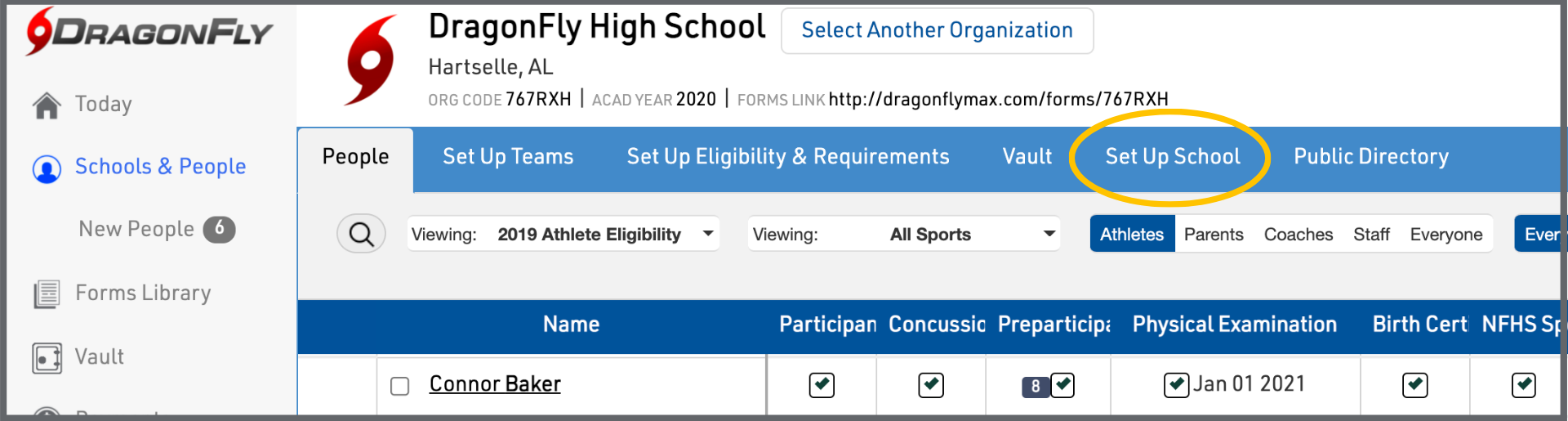 2. Select 'Set Up School' or 'Set Up Association' in the blue menu bar.