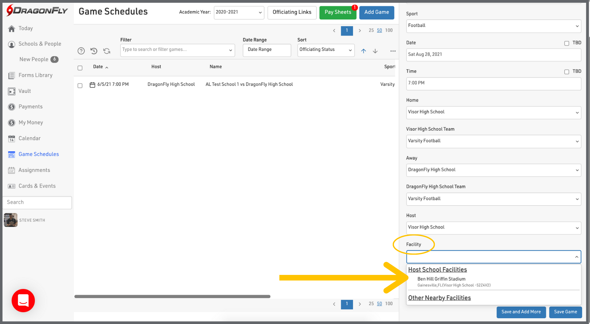 6. When adding a home contest to your Game Schedule, you will be able to select one of your facilities as the location.
