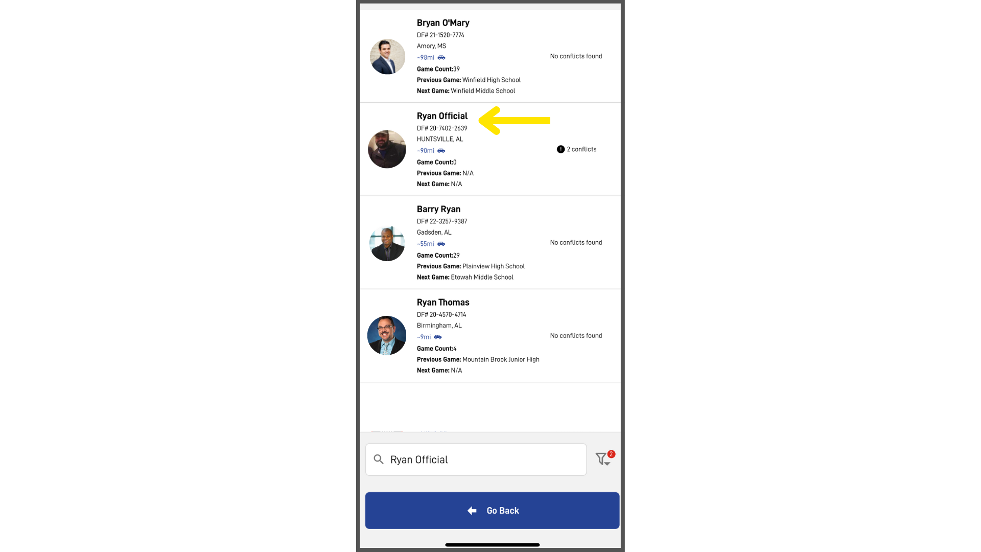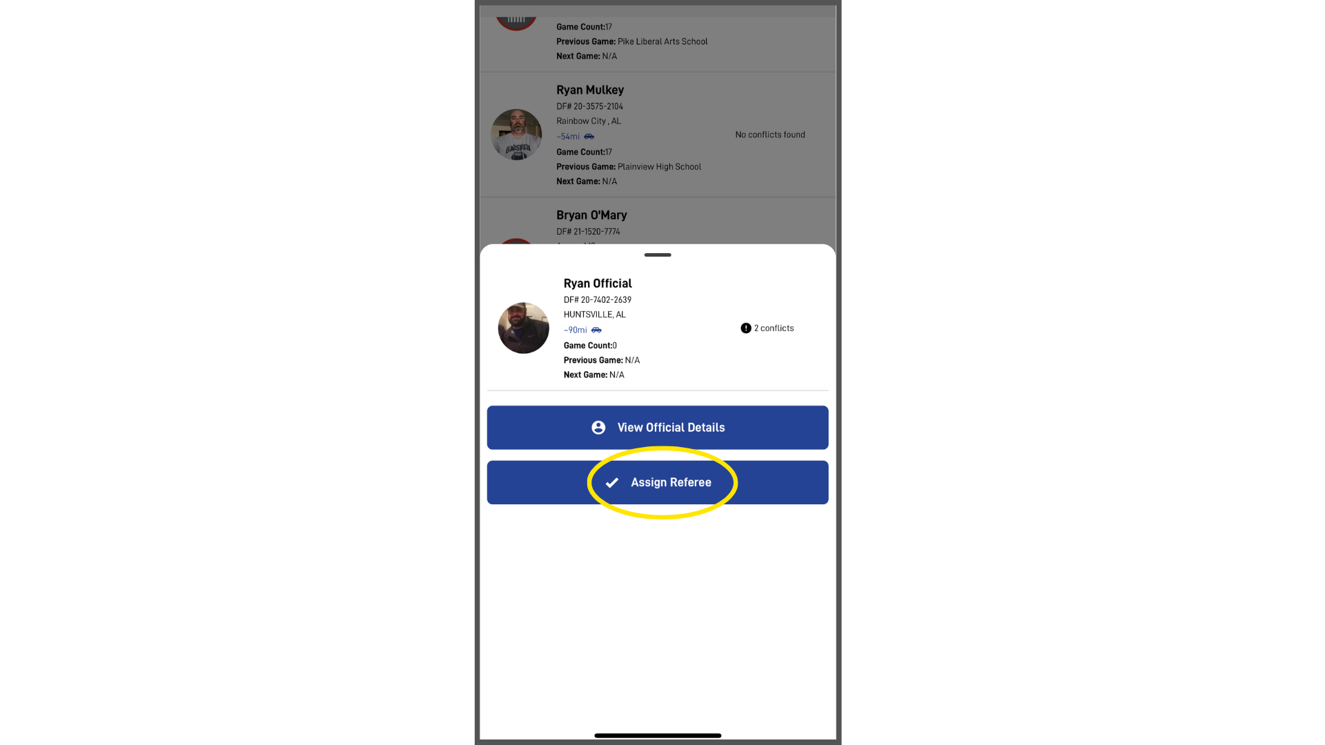 11. Tap the 'Assign' button to assign this official to the game. To learn more about the official, select the 'View Official Details' button.