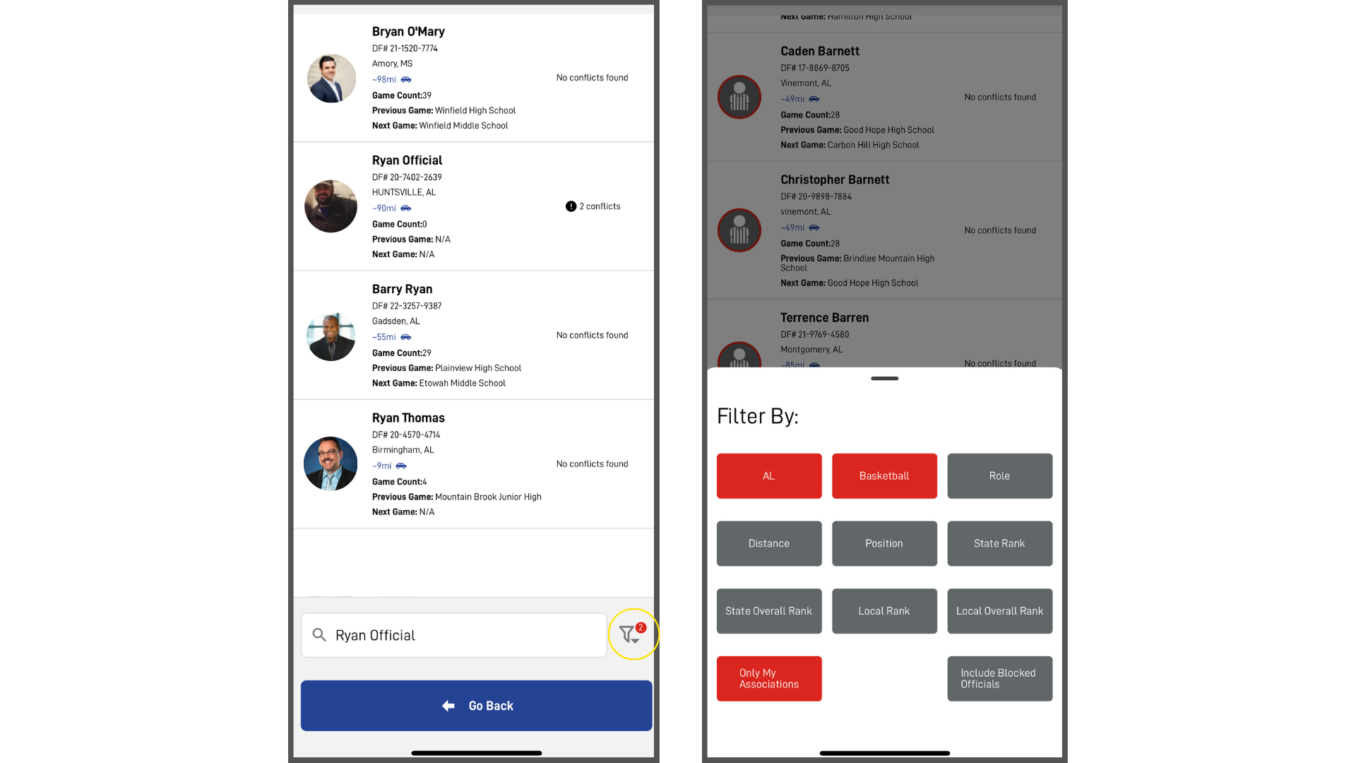 9. You will see a list of all available officials. To filter your list, select the funnel icon and tap on the filters you would like to implement. You can filter by state, sport, role, distance, position, rank, association membership, and blocked officials.