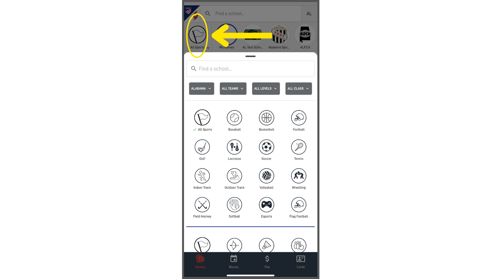 4. To filter your games list by Sport, State, Gender, Level, or Class, select the sports icon in the top-left corner of the screen, then tap on your filters in the pop-up window.