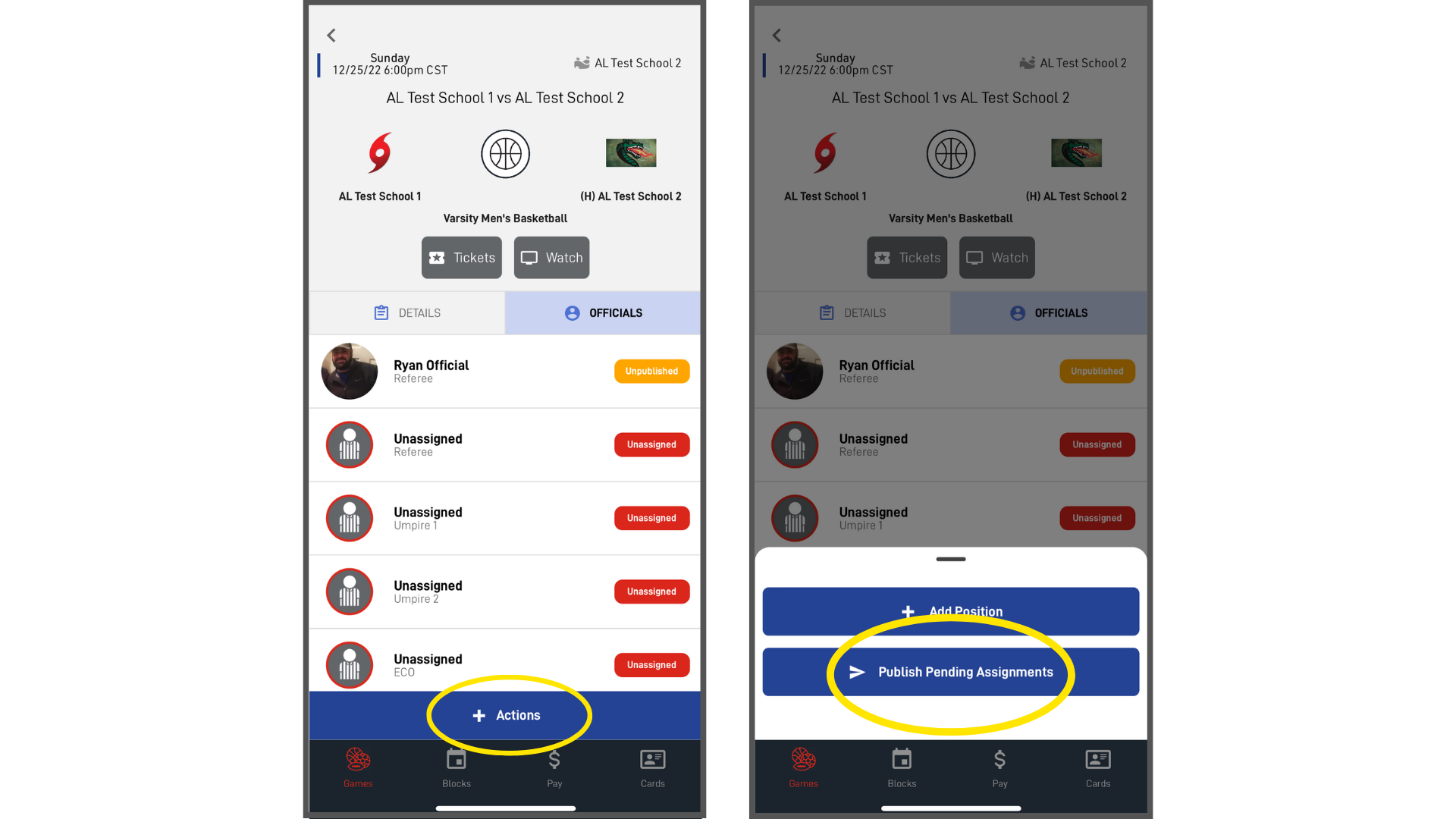 12. To publish the assignment, tap the '+ Actions' button at the bottom of the game, then tap the 'Publish Pending Assignments' button. This will notify the official of the assignment by email and push notification, giving them the option to accept or reject the assignment.