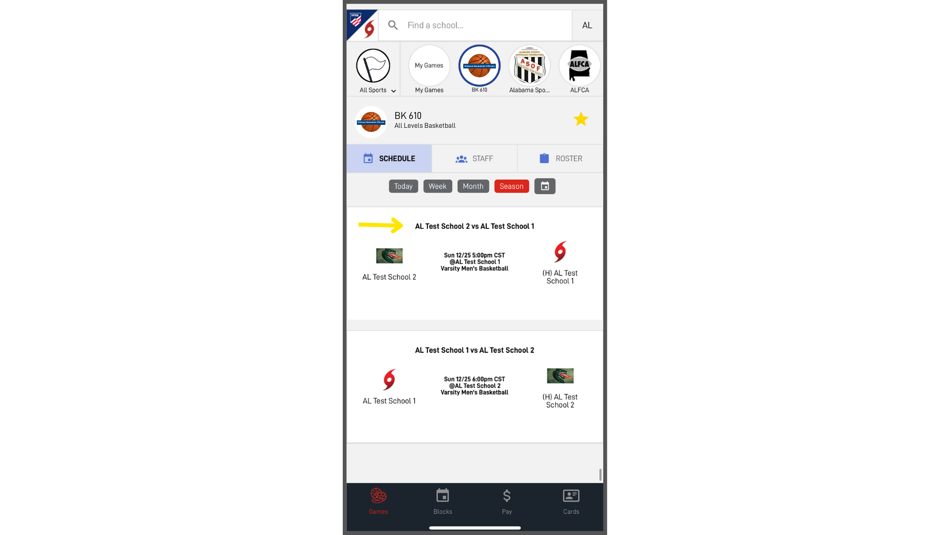 3. Upcoming games with your member school will appear in a list under the 'Schedule' tab. You can filter your list of games by timeframe by tapping on the 'Today-Week-Month-Season-Custom' filters to narrow your results.