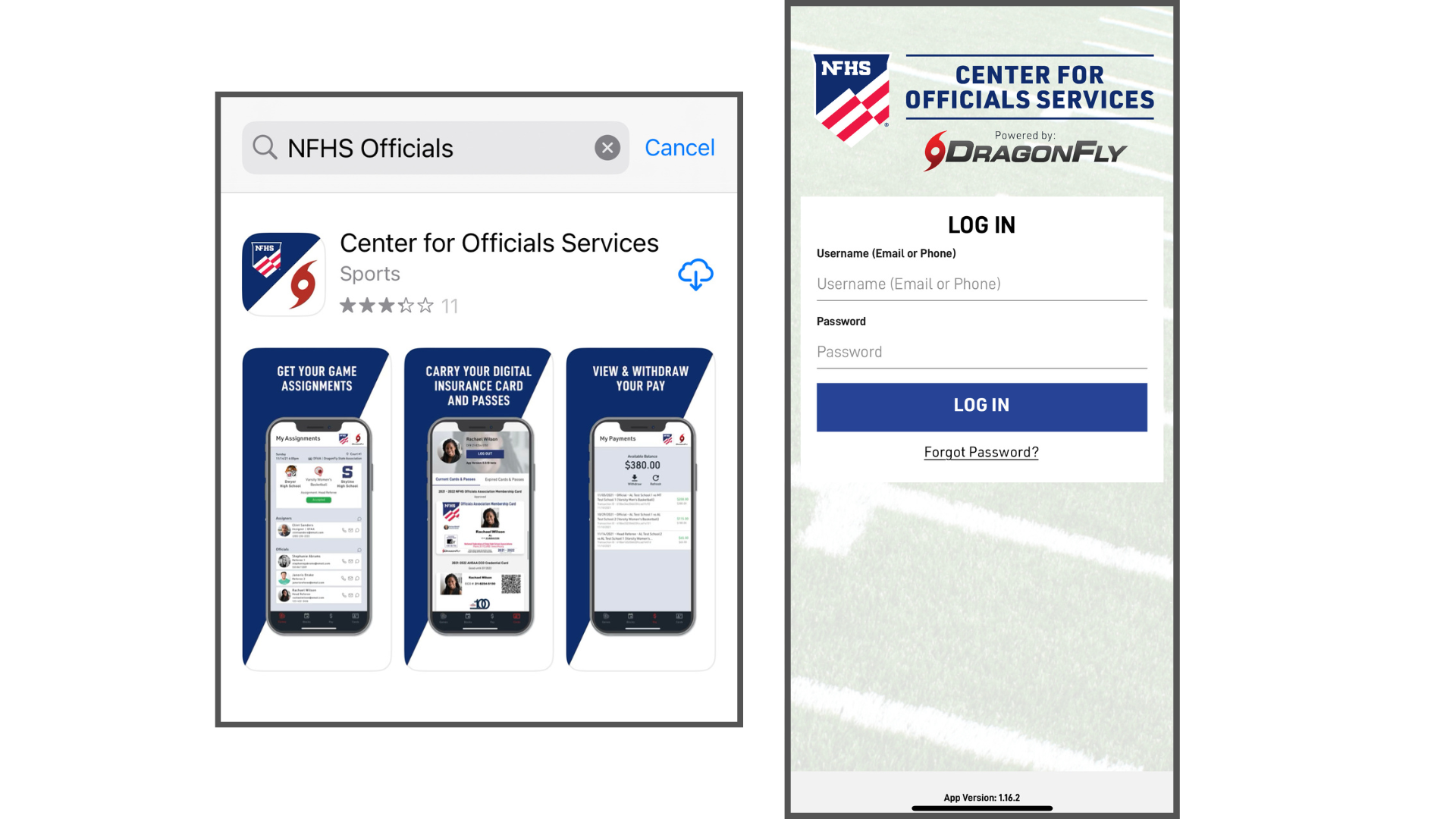 1. Download the NFHS Center for Officials App from the App Store (Apple devices) or Google Play (Android devices) and log in with your username and password.