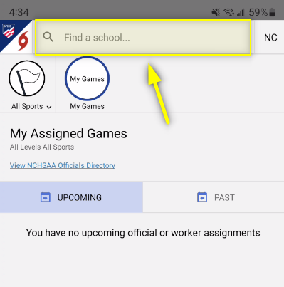 2. Search for the host/home school you wish to assign officials for in the search bar at the top of the screen and select it.