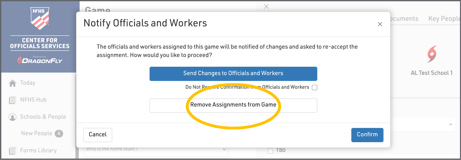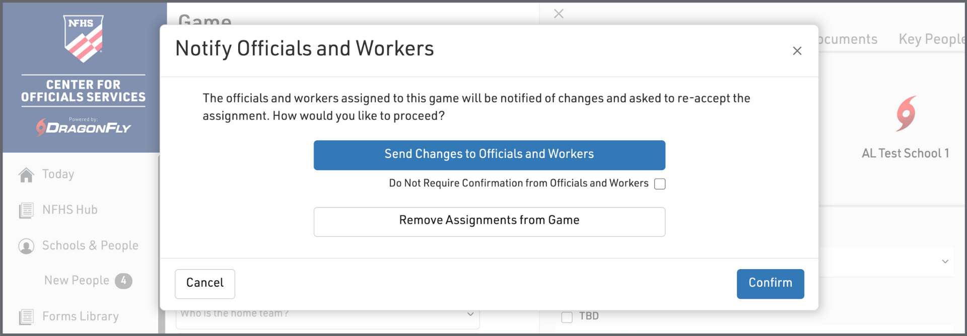 3. A pop-up window will appear, asking if you want to notify the officials of the change and ask them for confirmation. If you select this option, your officials will receive an email and push notification, asking them to re-accept the modified assignment.