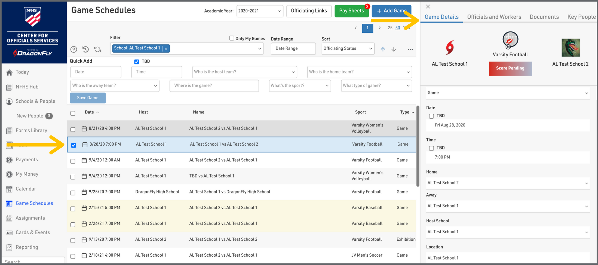 1. Log in to the NFHS Center for Officials Services (COS), powered by DragonFly, on your computer's web browser. Select 'Game Schedules' from the left-side menu.
