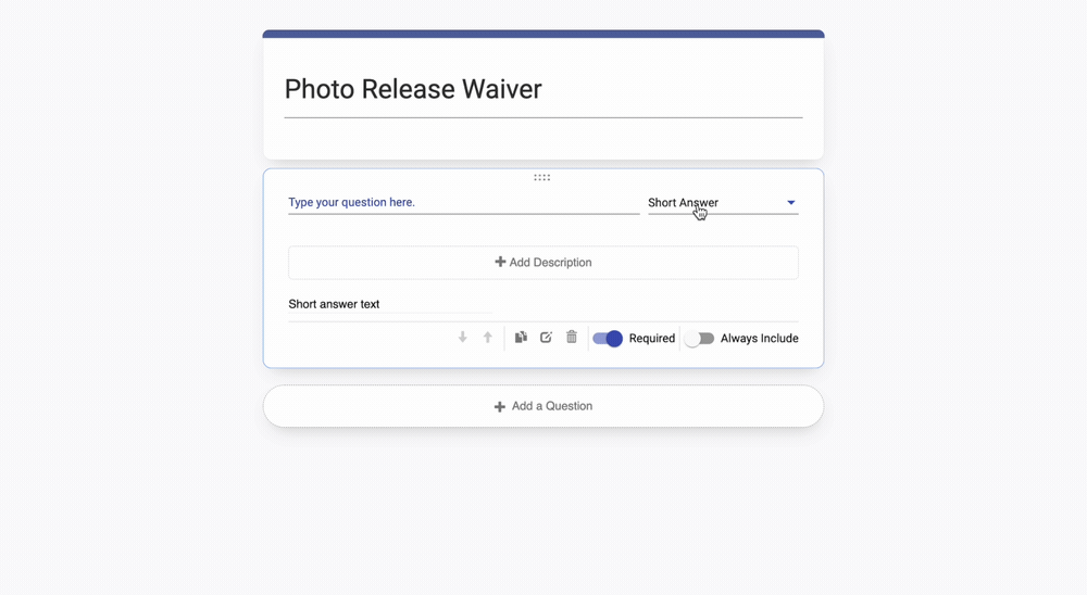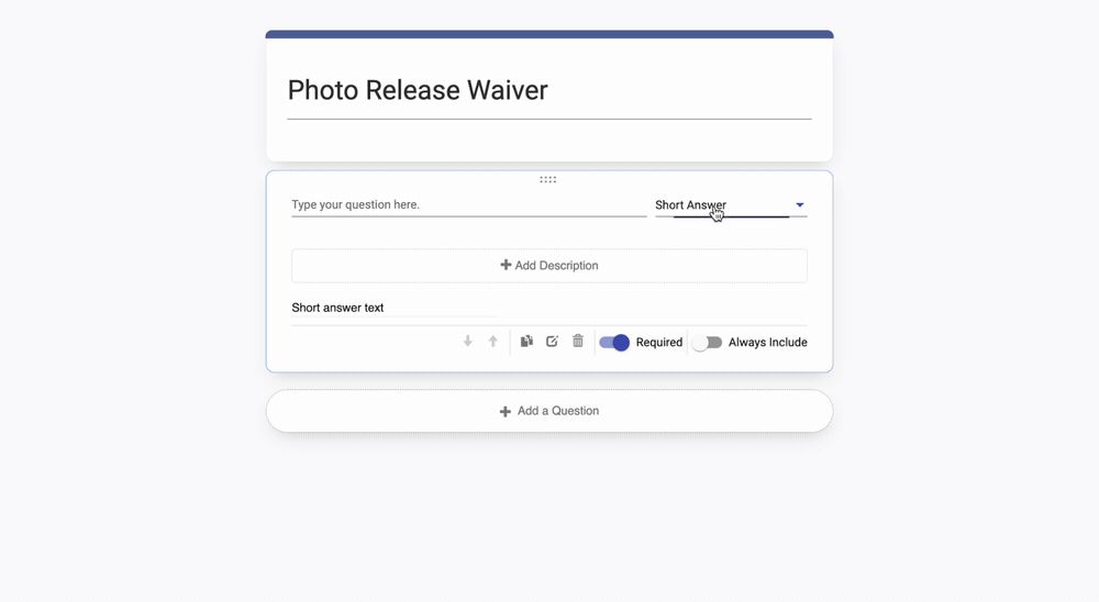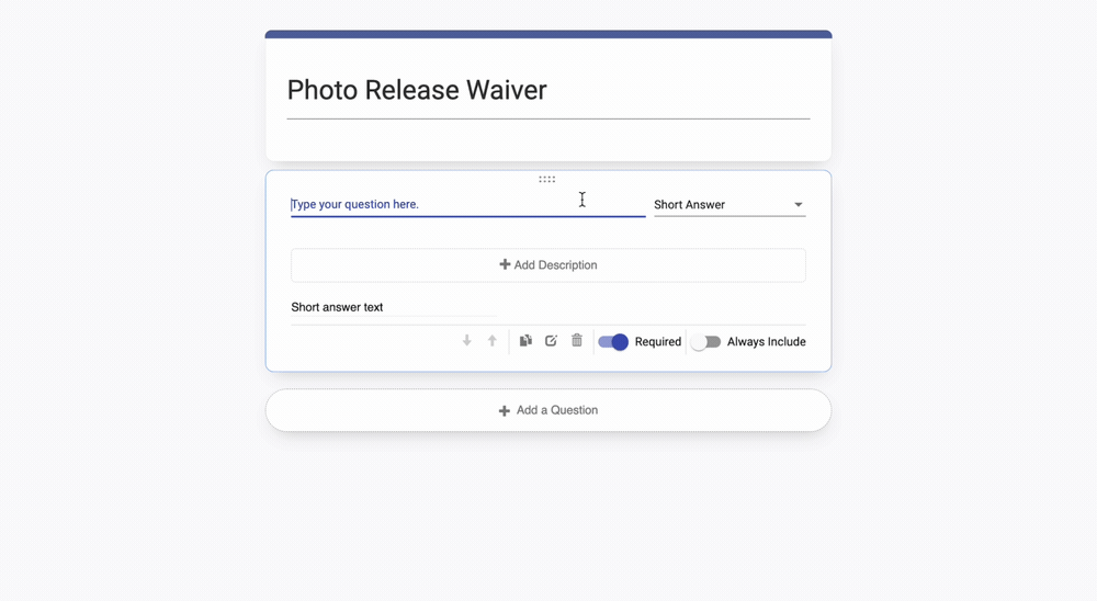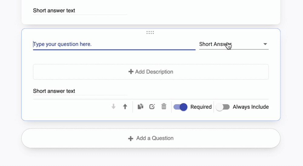 When you add a Short Answer, type in both the question or prompt (in the above example, "Name") and a brief description, if desired.
