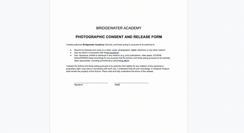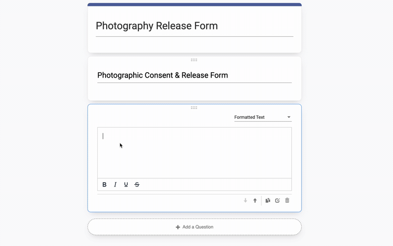 This is also a useful field where you can paste in text from an existing document. In the below example, a photo release waiver is copied from a Google Doc and pasted into the Formatted Text field.