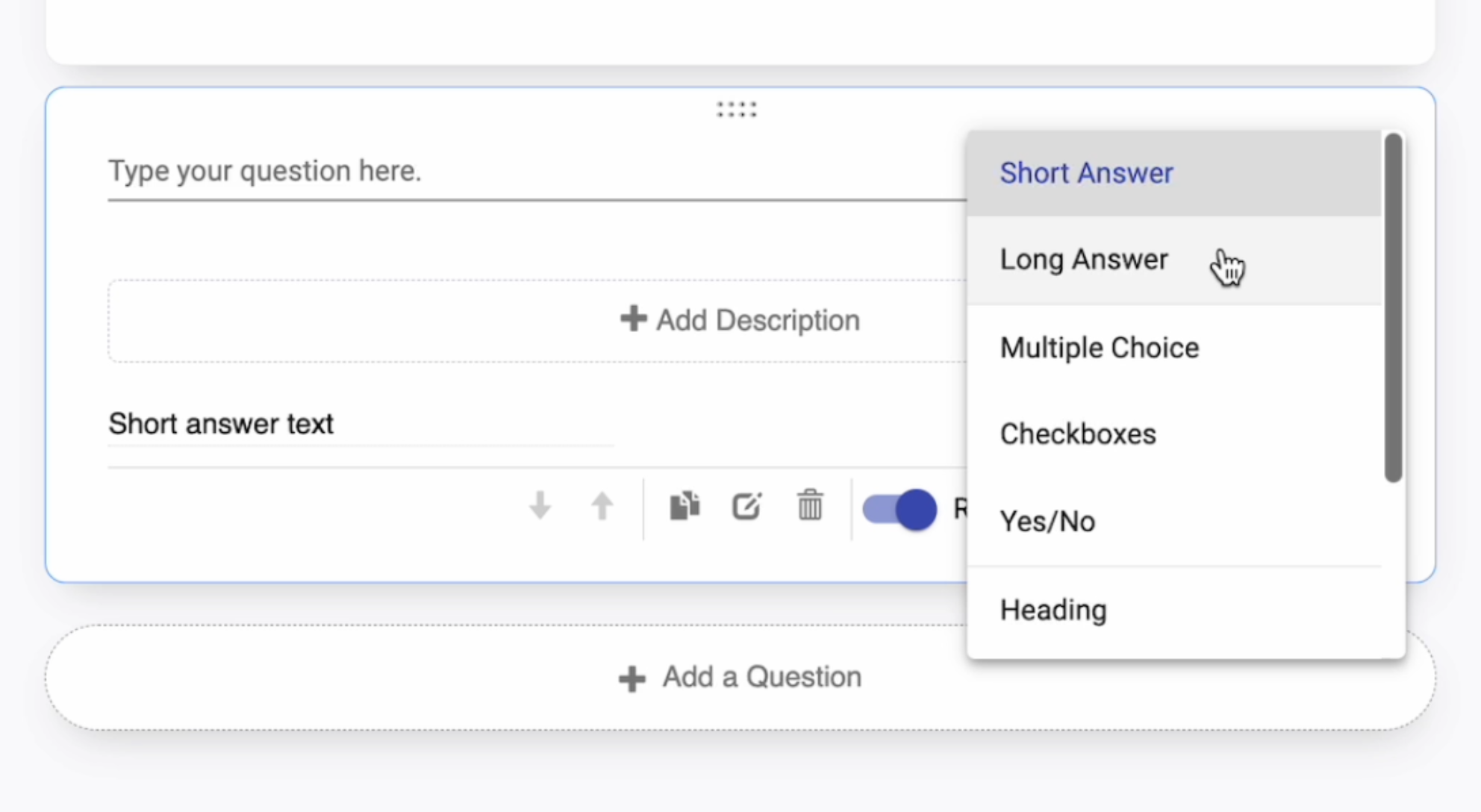 The options for questions are Short Answer, Long Answer, Multiple Choice, Checkboxes, Yes/No. You can also add non-question elements such as Heading and Formatted Text. Finally, you can add a Signature or Date. Below you can find information about each.