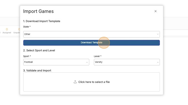 In the window that pops up, first set the Sport and Level, then click Download Template to download the Excel spreadsheet template.