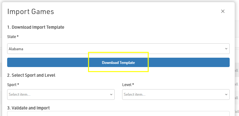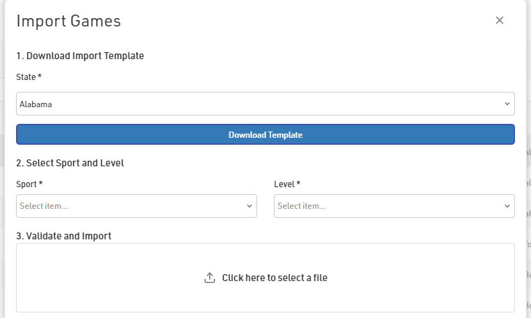 8. Select the Sport and Level in which you are importing for. Then click on "Click here to select a file." You will be prompted to select the file from your computer