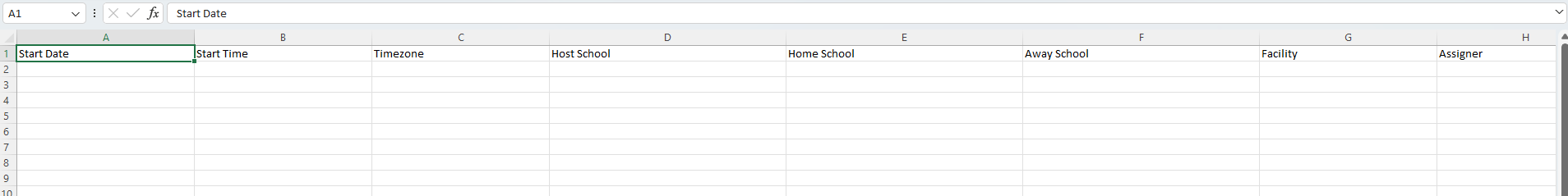 6. Once the template is downloaded, you can enter the information in the Excel sheet. **Note** the cells will populate with schools in the selected state that you downloaded the template for AND, you can only import the schedule for one sport and level at a time. So make sure you are completing the template for one sport/level (ex. Varsity Boy's Basketball)