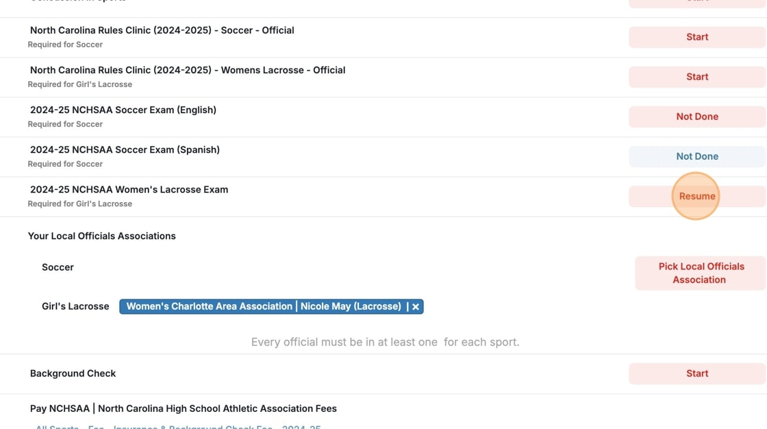 Click Start or Resume to fulfill any incomplete item.