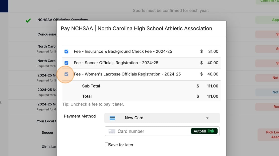 Use the checkboxes to select or deselect fees as necessary and fill out payment information below to pay.