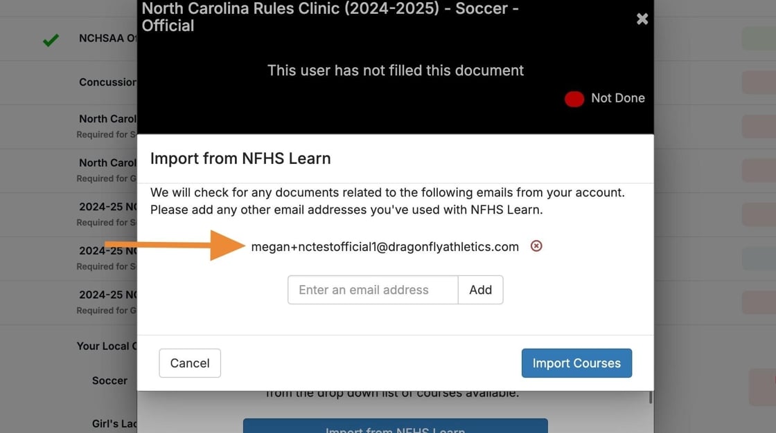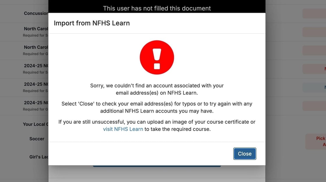 If a yellow icon appears, then the email address was a match but the matching course was not completed on NFHS Learn.
