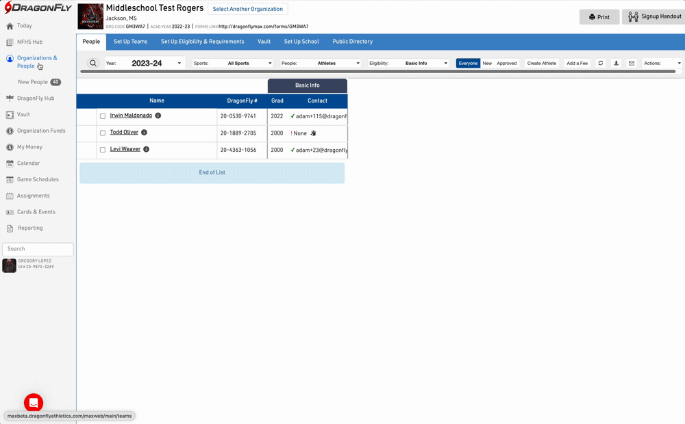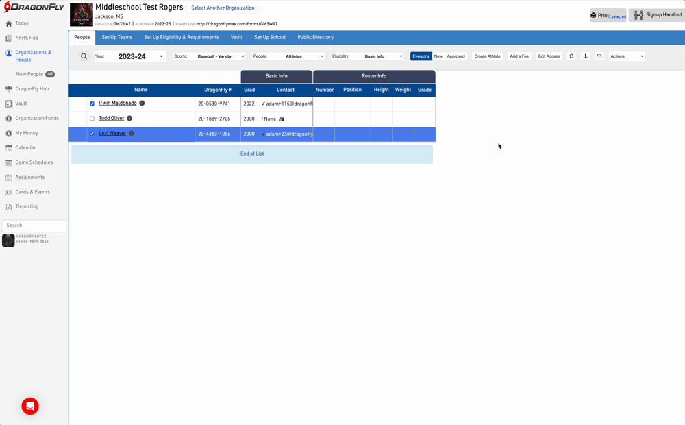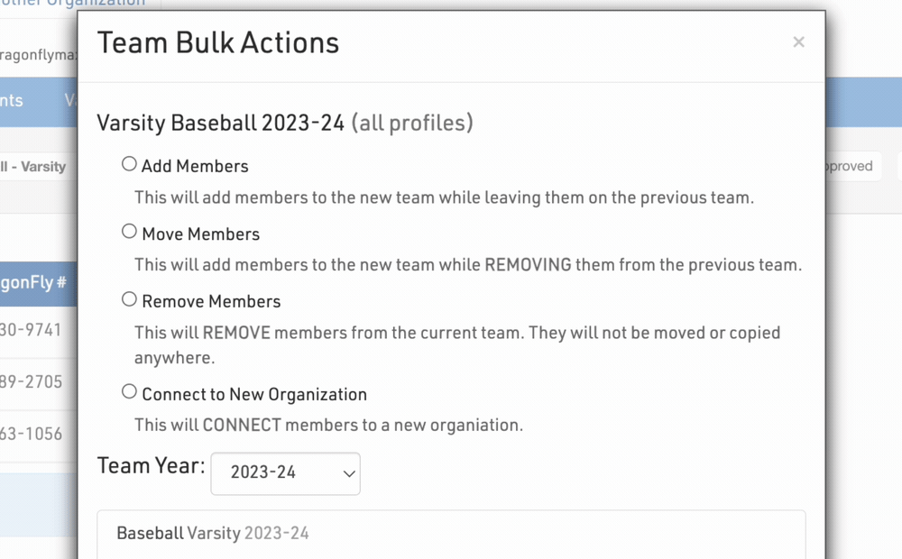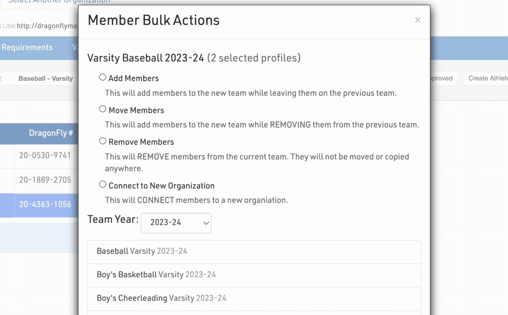 Quickly add student-athletes or entire teams to another organization by using bulk actions in DragonFly