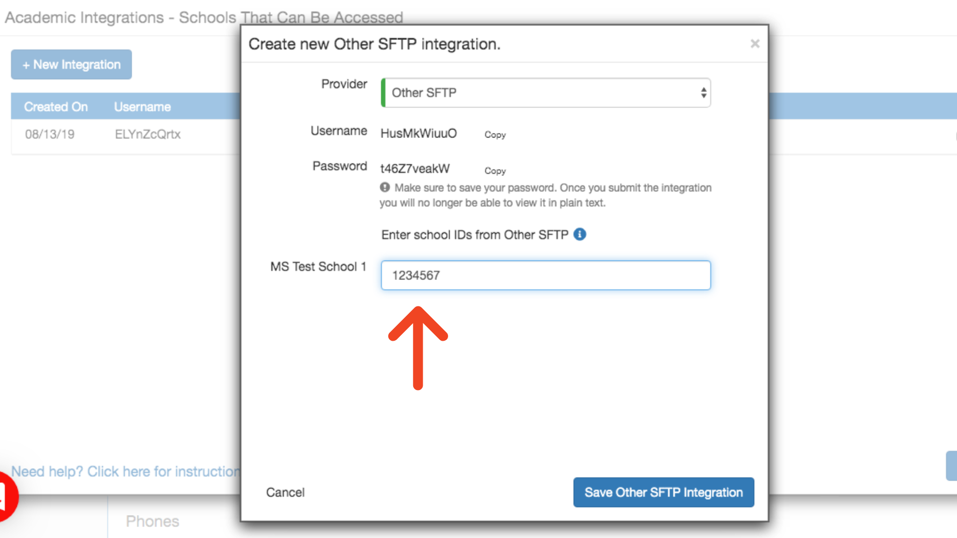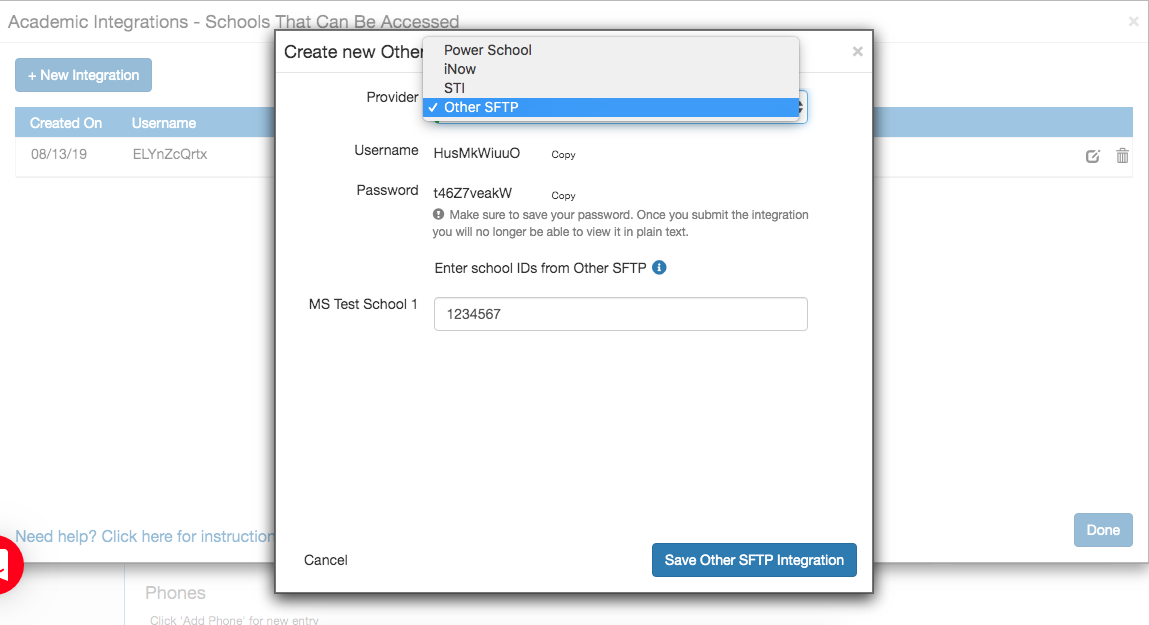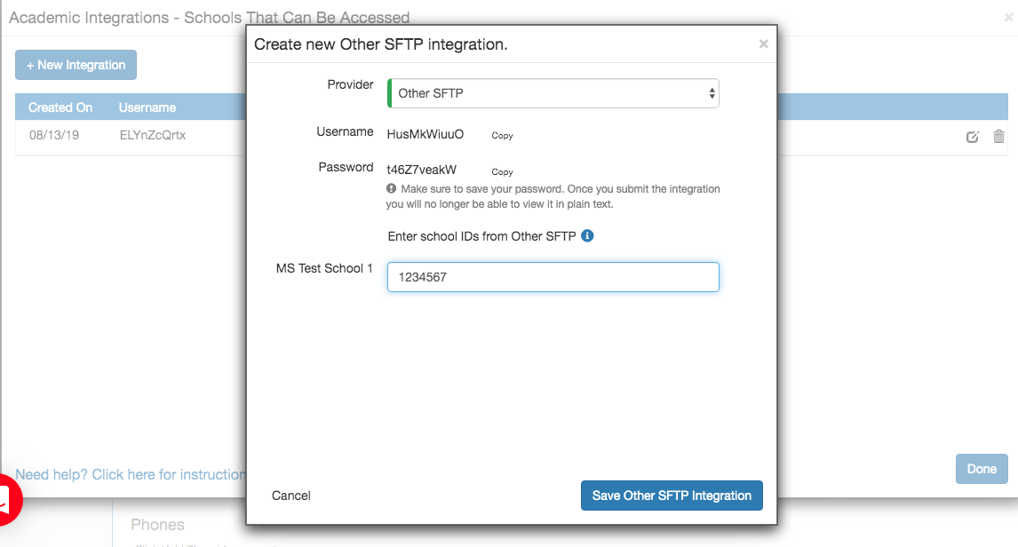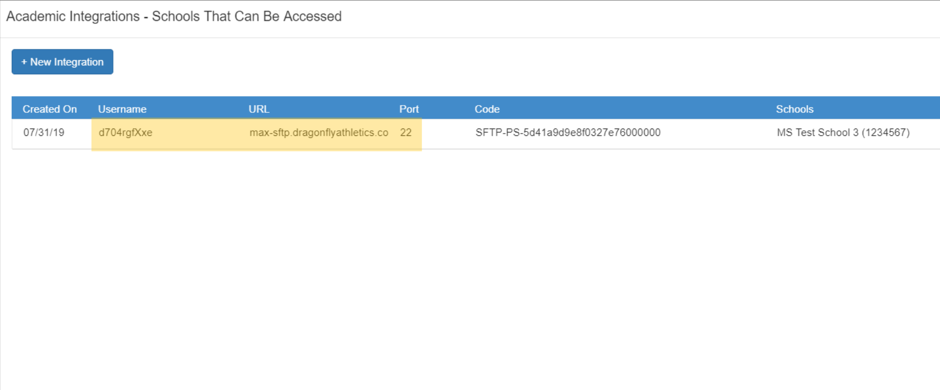 5. Click “Save Integration” to submit the SFTP information to DragonFly and return to the Setup screen. Copy and save the information highlighted below. You will need this info to connect DragonFly MAX to FACTS/RenWeb.