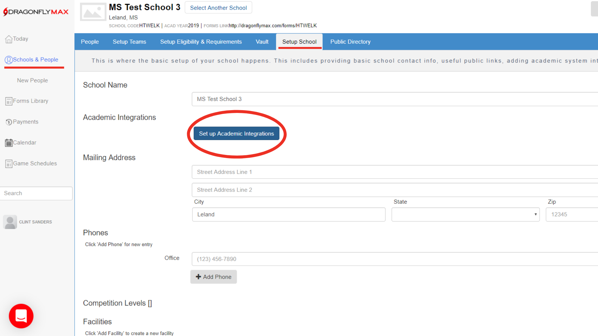 Sign in to DragonFly MAX in your web browser. Click “Schools and People” on the left side menu, then select “Setup School” from the top menu. From the “Setup School” screen, click the “Setup Academic Integrations” button.