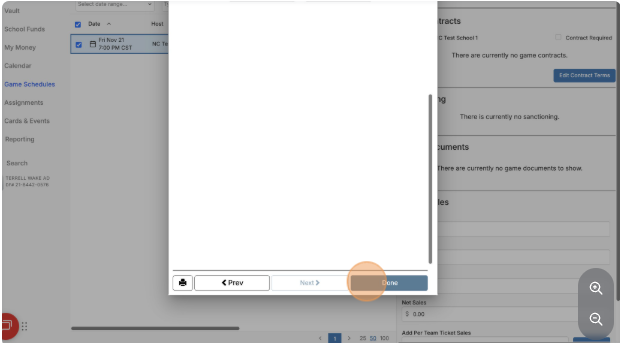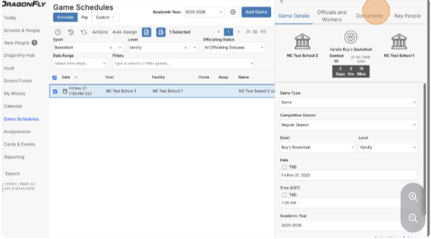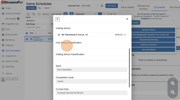 Verify the game information (sport, competition level, contest date).