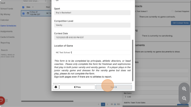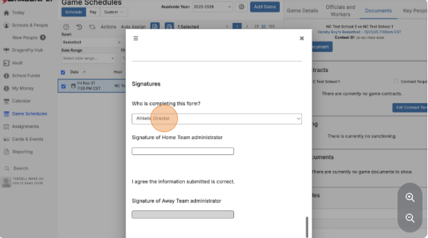 A step-by-step guide for athletic administrators to complete, sign, and submit the required NCHSAA 5-Quarter Basketball Form directly from a scheduled varsity game.