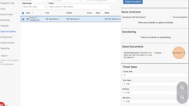 The Away Team will see the already-started form under Game Documents and can click View Report.