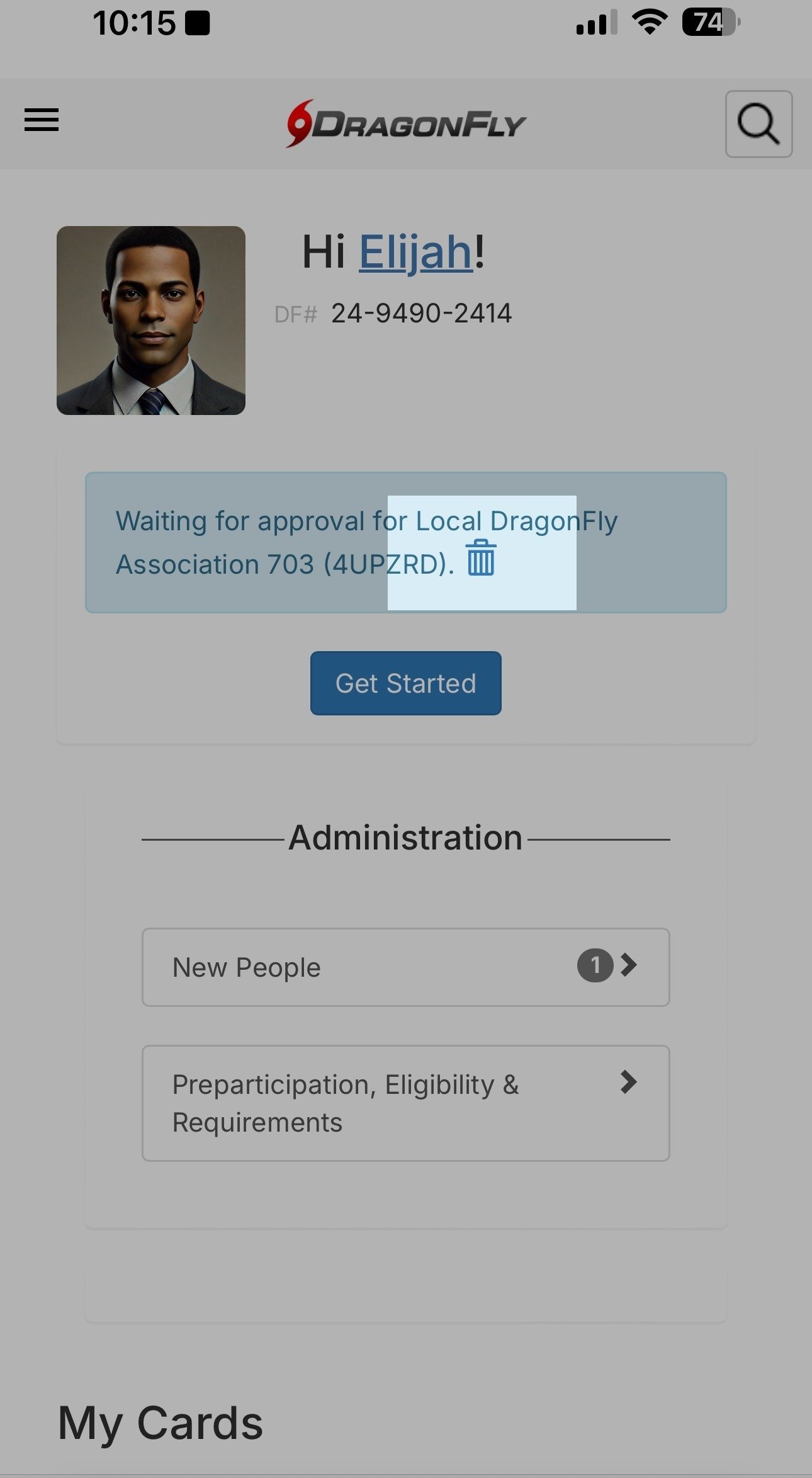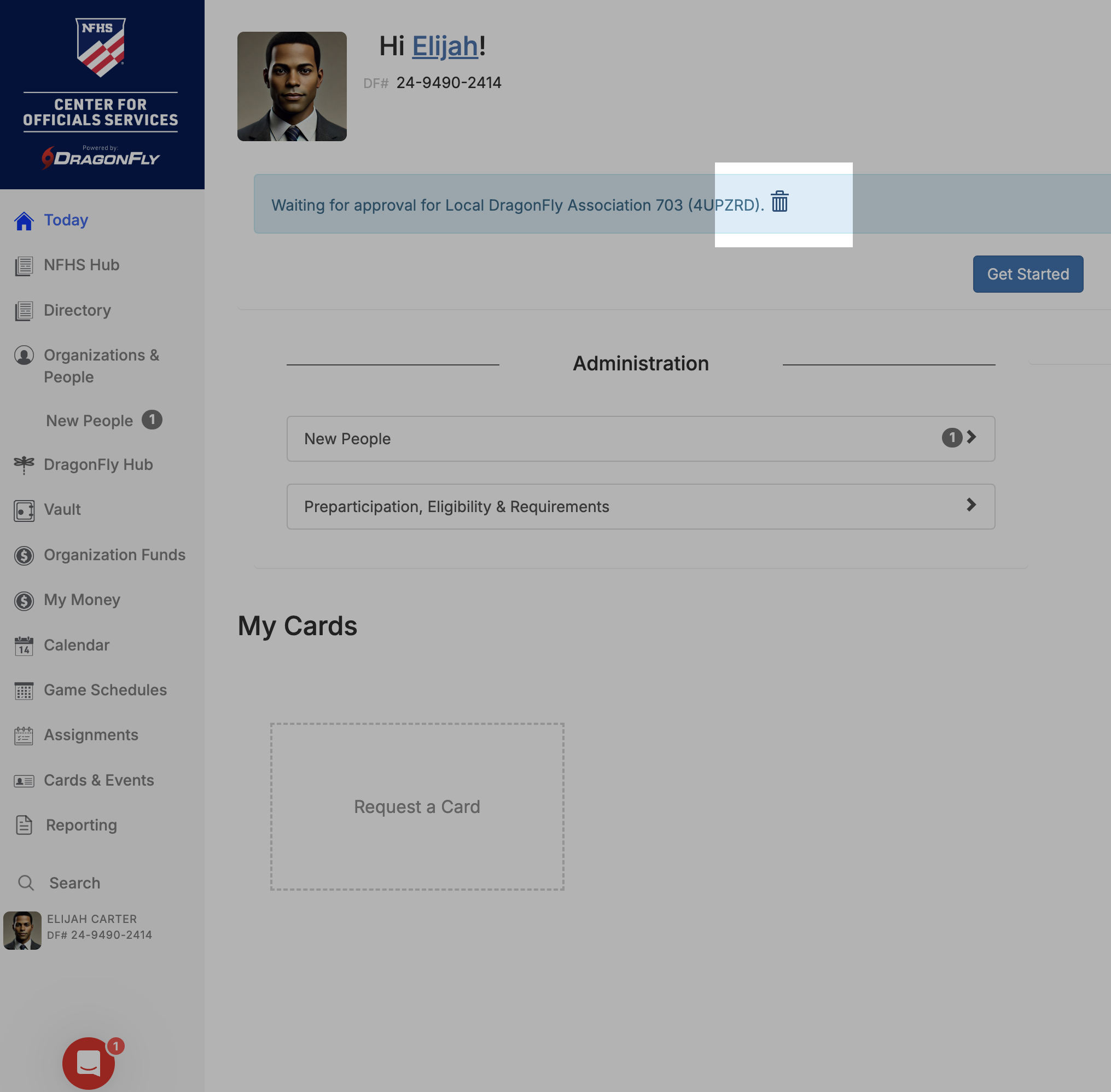 On desktop or mobile, return to the 'Today' page on DragonFly. You will see a blue banner on both that says "Waiting for approval for [your school or organization]" with a trashcan icon next to it (highlighted in the screenshots below).
