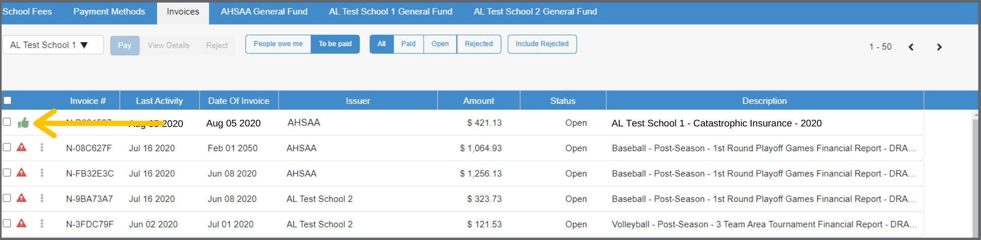 3. You will see the invoice in your 'To Be Paid' list. Under the 'Issuer' column you will see AHSAA and under the 'Description' column you will see [Your School Name] - Catastrophic Insurance - 2020. Double click on the line item to open the invoice.
