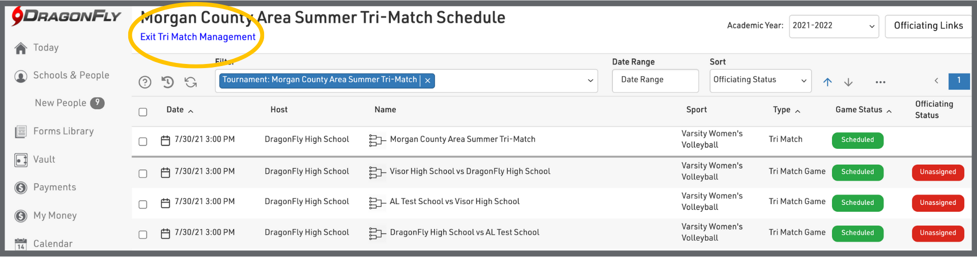 7. When all information has been entered about the Tri-Match, select 'Exit Tri-Match Management' to return to the Game Schedule. You will see your Tri-Match in the list and can click on it to re-enter Tri-Match Management Mode and make updates.
