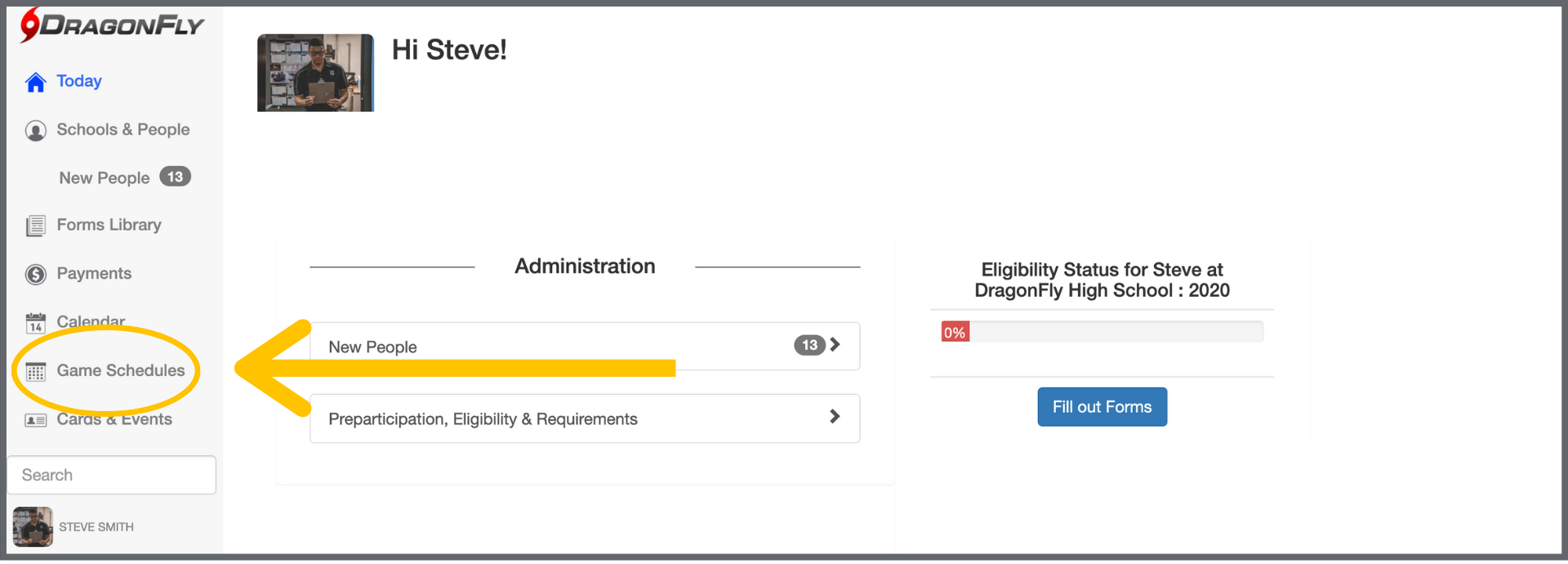 1. Log in on your computer's web browser and select 'Game Schedules' from the left-side menu.