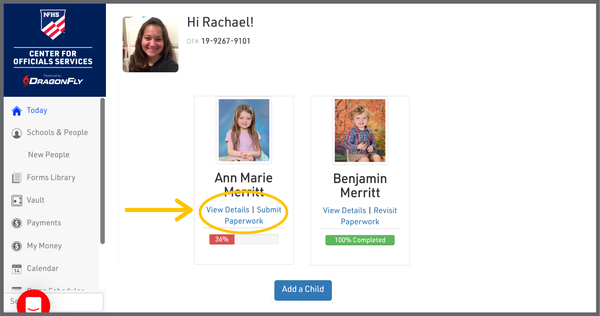 8. Select the 'Submit Paperwork' button under your child's profile to fill out their forms for the school. You do not need to wait for school approval to complete registration.