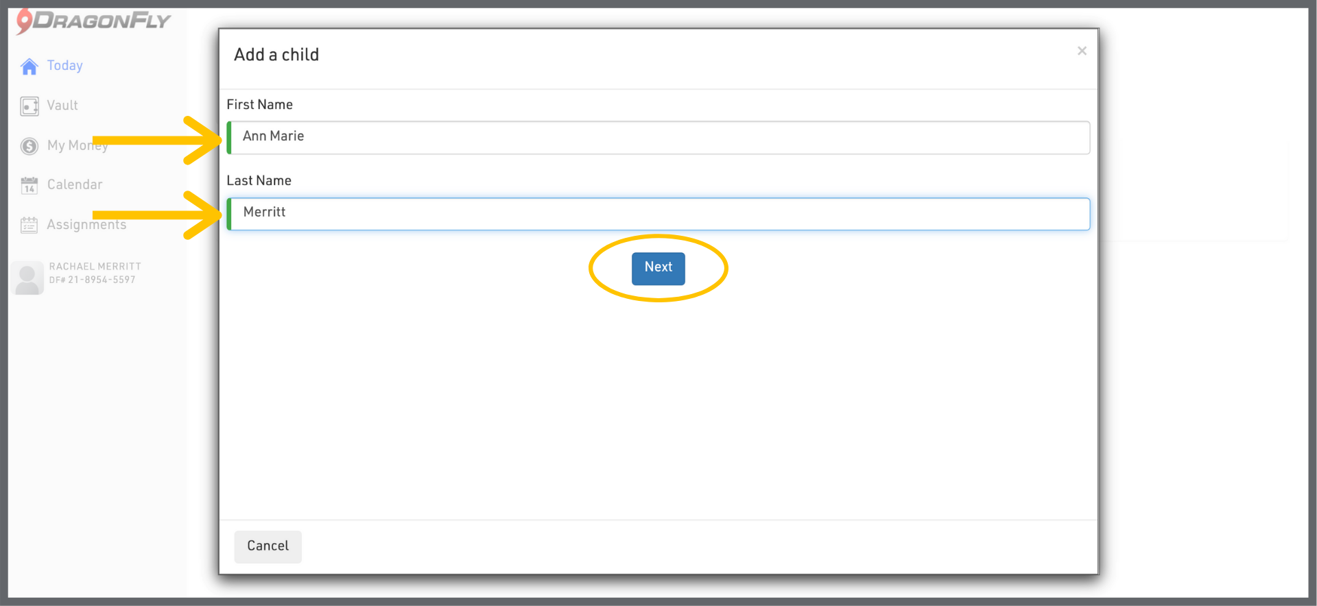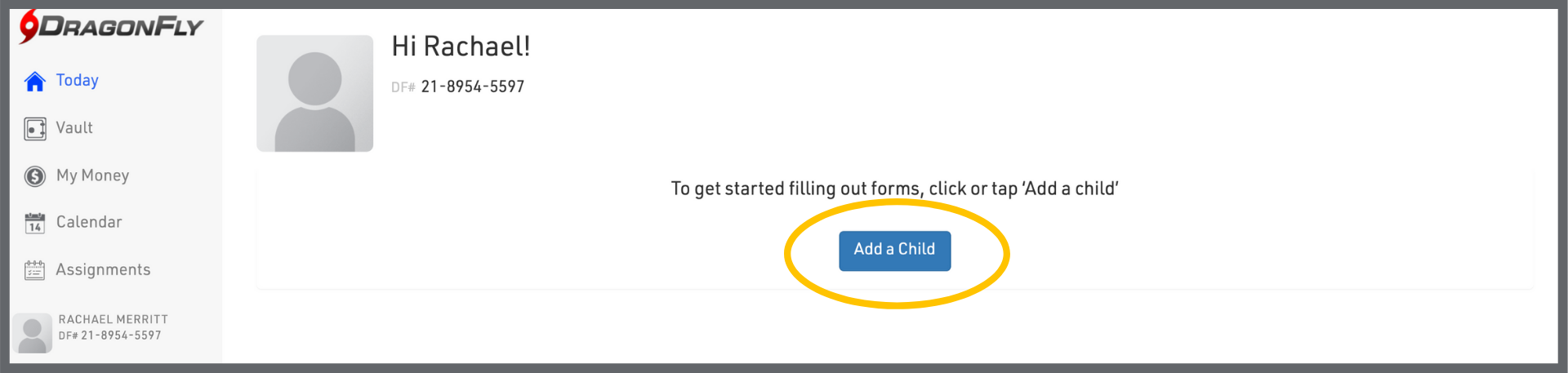 1. Log in to DragonFly on your computer's web browser and select the 'Add a Child' button on your Today page.
