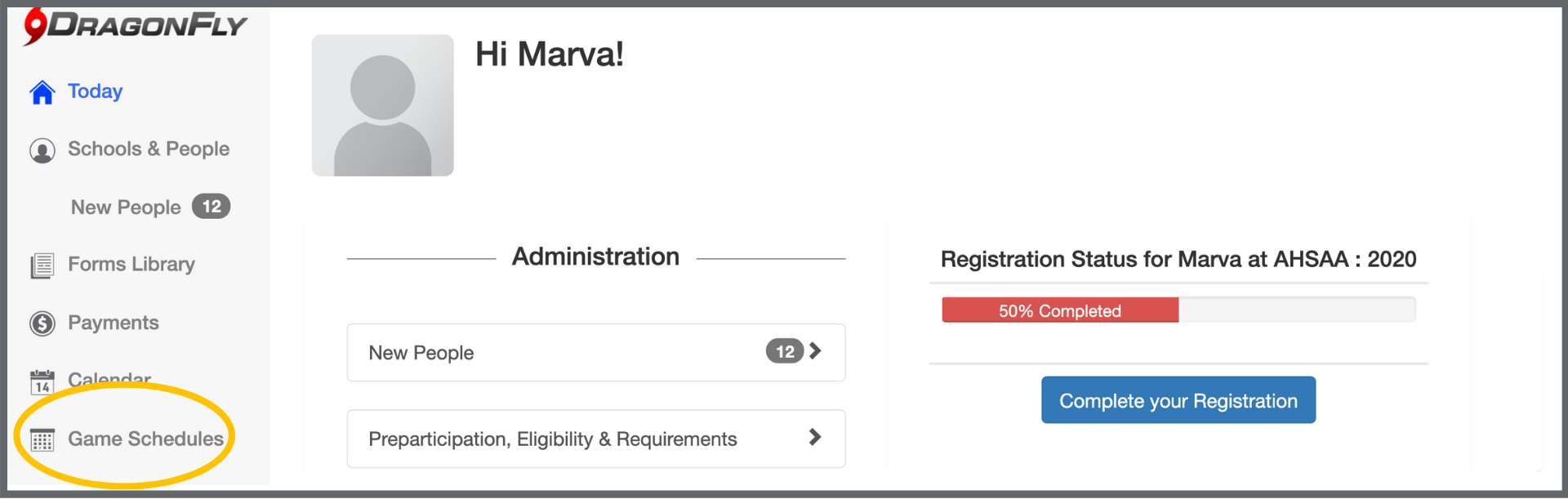 1. Log in to DragonFly on your computer's web browser and select 'Game Schedules' from the left-side menu.