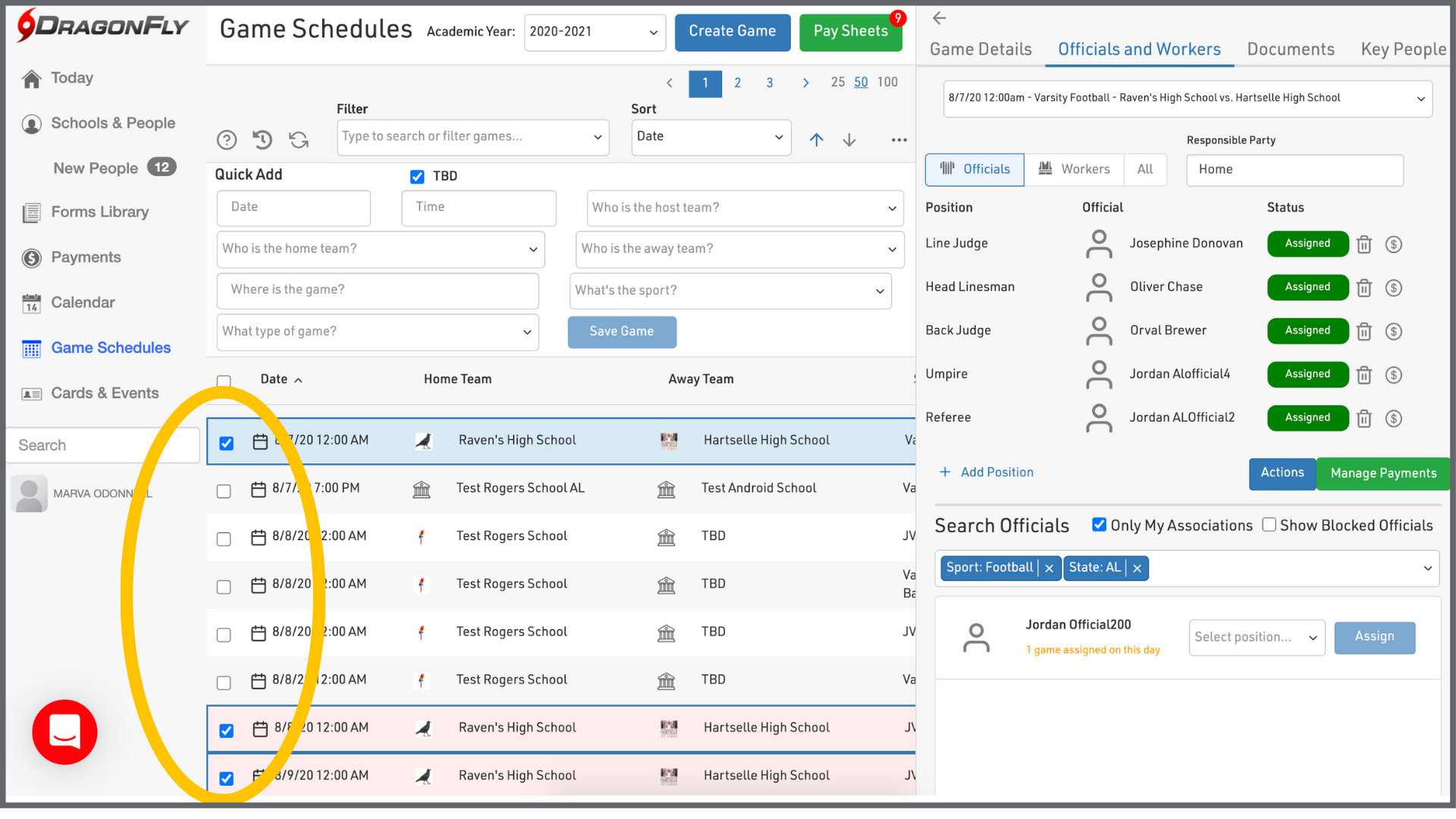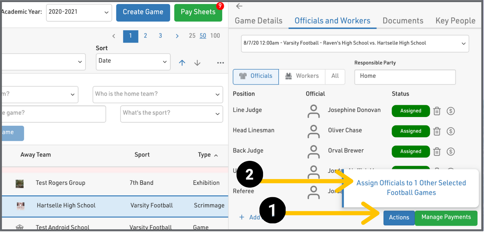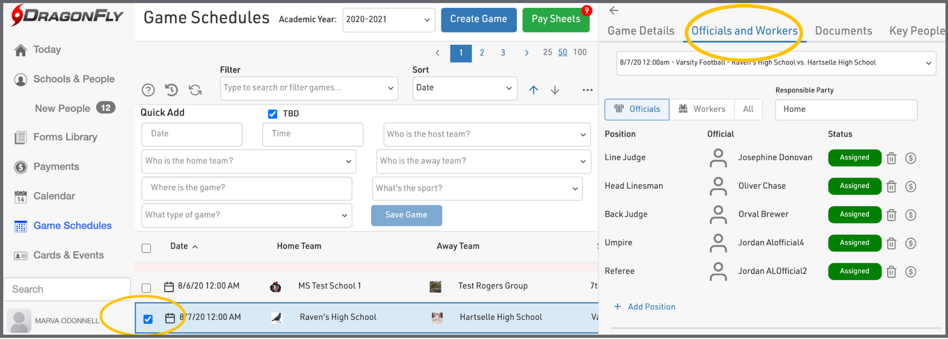 2. Select a game from the list that you would like to assign, then select the 'Officials and Workers' tab in the right-side panel. Assign your officials to the game.