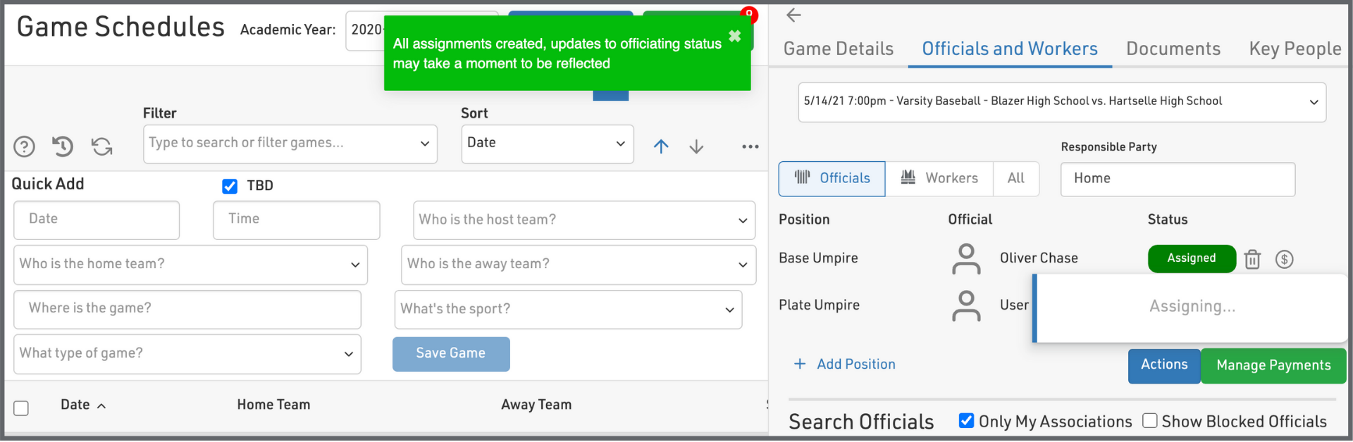 6. The system will assign this crew to the multiple games you selected. You will receive a green confirmation message at the top of your screen when complete. If there were any scheduling conflicts in your selection, you will see an error message in red, notifying you of the conflict.