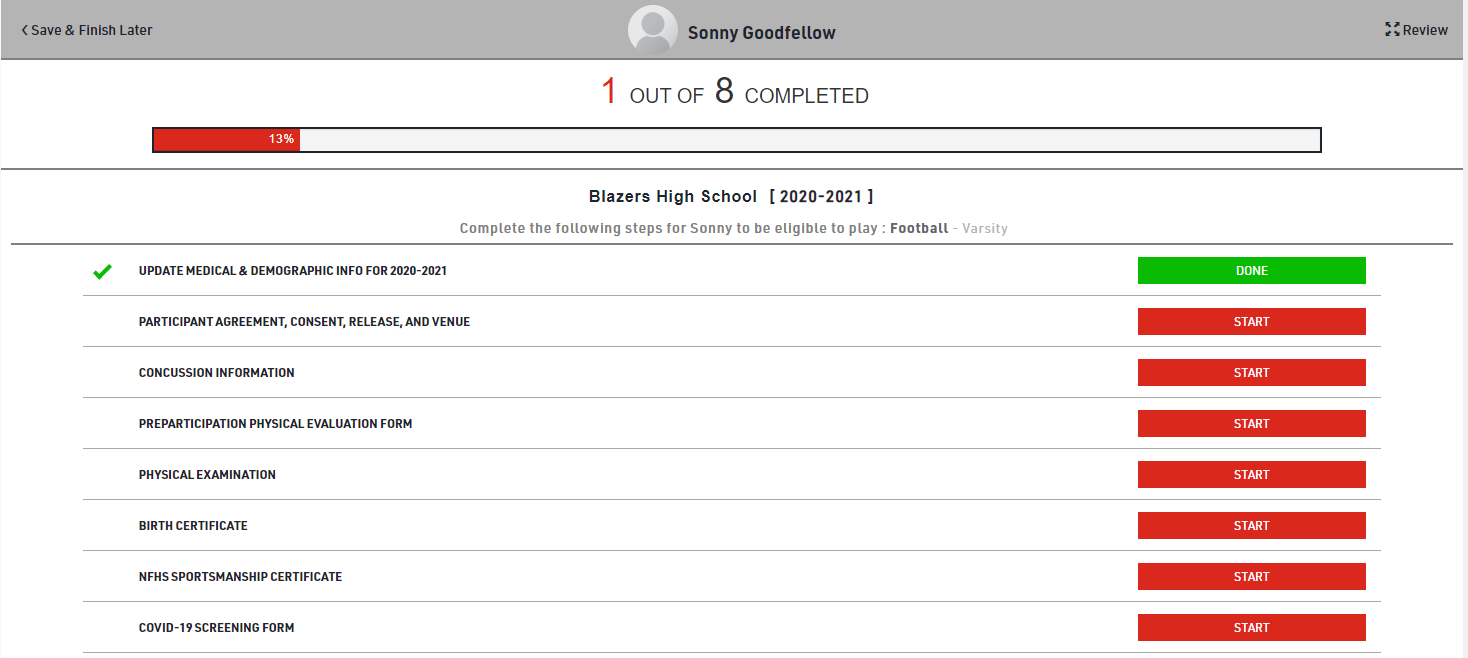 On the 'Today' page, you will find a meter showing your % of completion for eligibility. This step will look different for parents than it will for officials and staff: