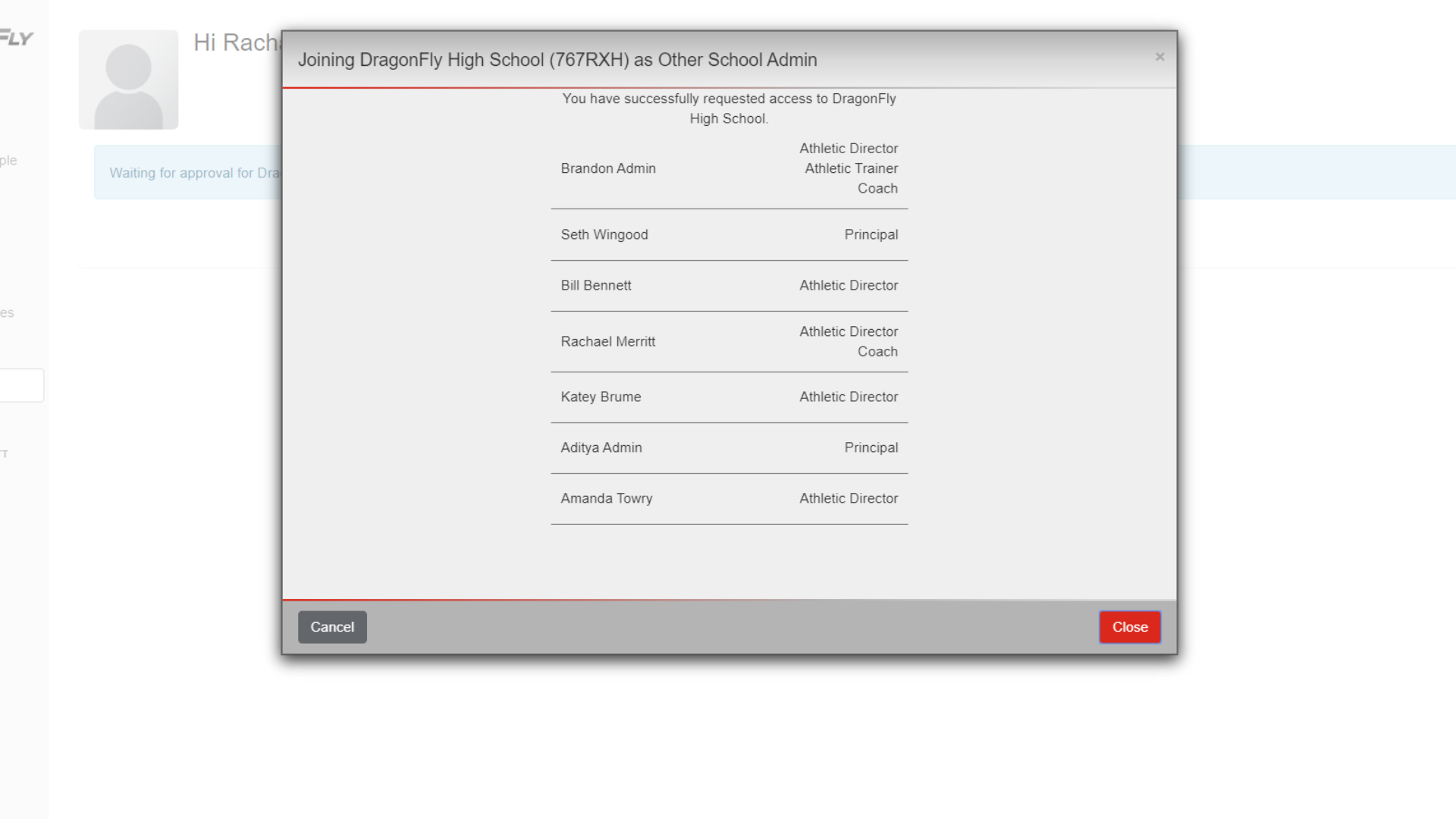 Step 4: You will receive a confirmation message, as well as a list of administrators at your school who can approve your request in DragonFly.