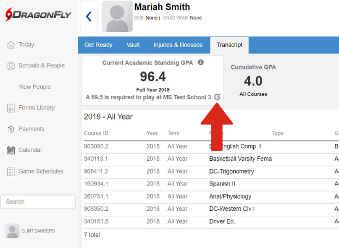 6. You should now see the grade requirement under the student's name, as well as all other students with transcripts in DragonFly.