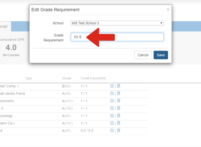 5. Select your school from the drop-down menu and input your grade requirement in terms of numeric calculation, then click "Save". (For example, if your academic requirement is a "C" and your school considers 69.5 a "C", you would type 69.5 as your requirement.)