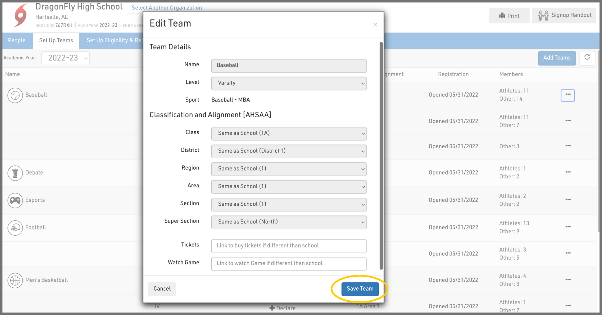 5. To make changes, update the fields in the pop-up window, then select the 'Save' button. If any of the sections are disabled, this means your state association does not allow updates to declared teams.