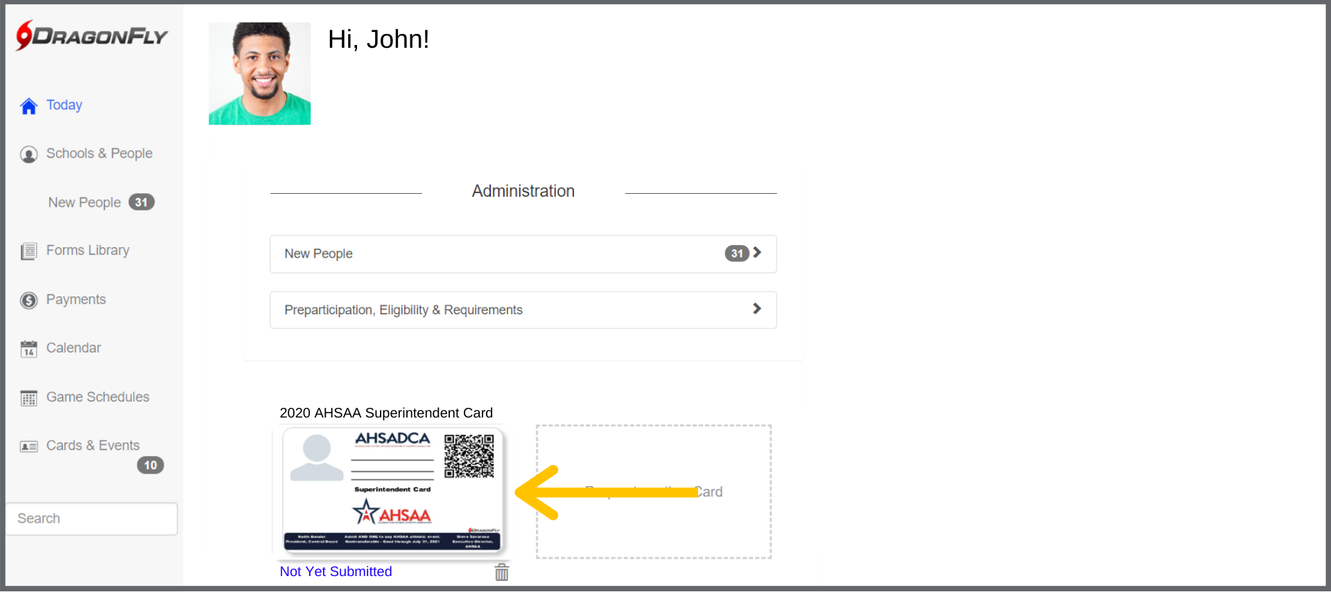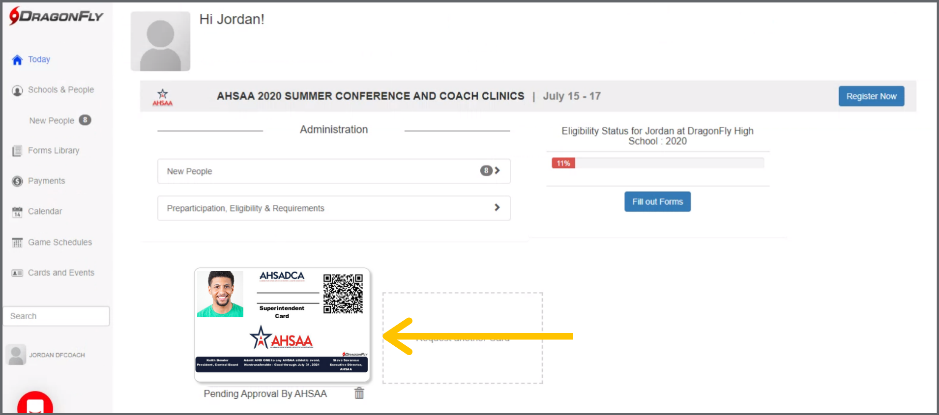 11. You will be redirected to your Today page where you will see your card and a 'pending approval' message. Once your card has been approved by the Superintendent and/or AHSAA (depending on your role), you will receive a confirmation email.