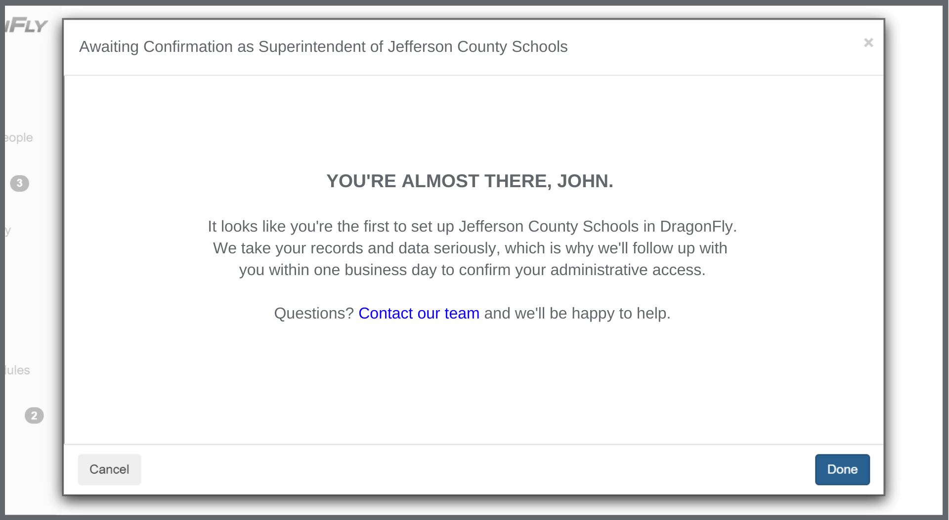 7. A member of the DragonFly team will verify your identity within 1-2 business days and approve your account with access to the school district/system on DragonFly. You will receive a confirmation email from DragonFly once you have been approved.