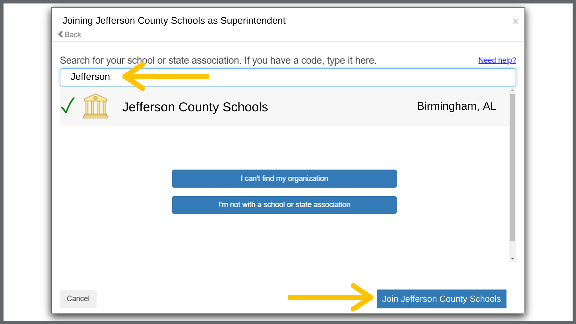 5. Select 'Alabama' as your state. Then, type the name of your school district or system in the search bar. Select your district from the list and click the 'Add' button.