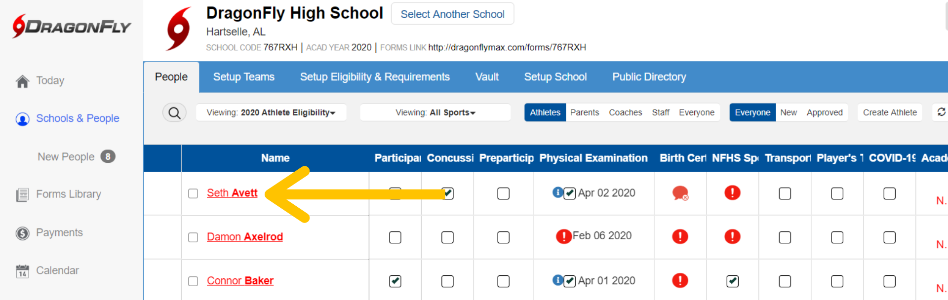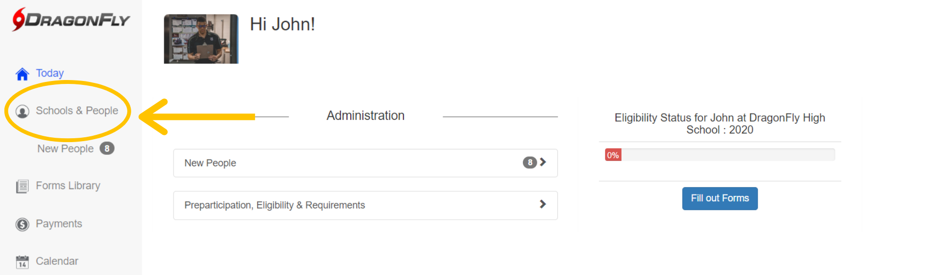 1. Log in to DragonFly on your computer's web browser and select 'Schools and People' from the left-side menu.