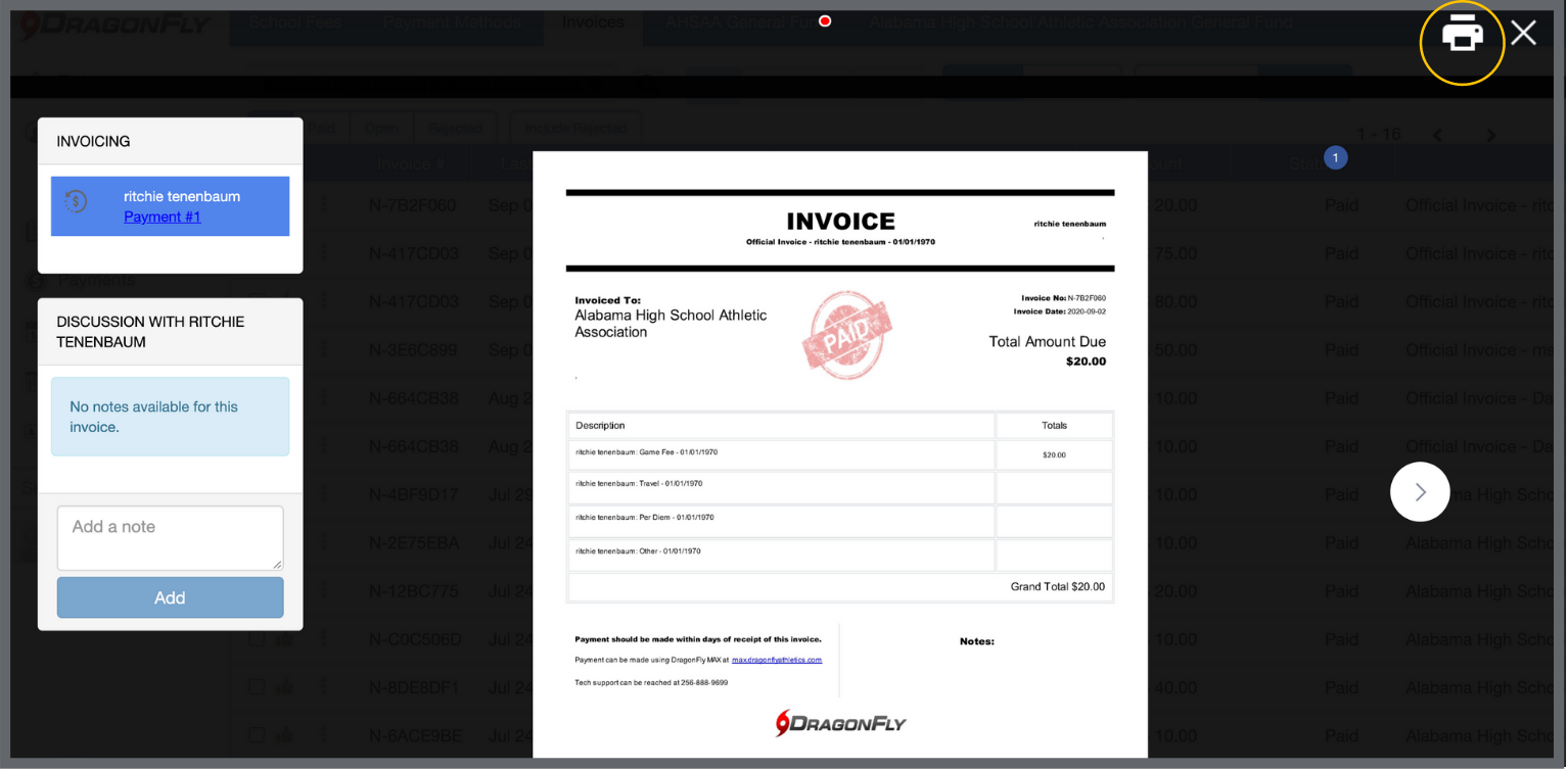 11. Double-click the transaction and a printable invoice will appear in an overlay. Select the print button in the top-right corner to either print or download the document.
