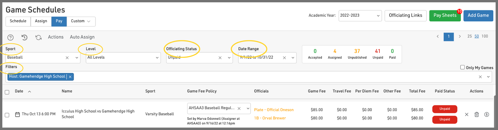 2. Select the 'Pay' tab at the top of the screen. This will provide a view of the schedule that is optimized for paying officials and game workers.