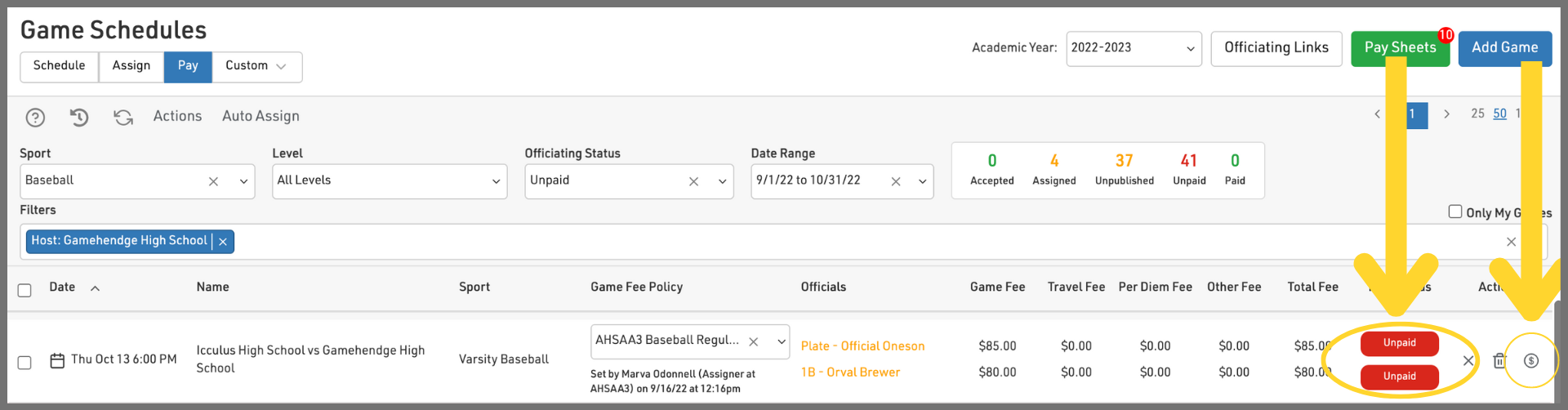 If you want to pay for multiple events, select the 'Add to Pay Sheet' button and this game and all assignments will be added to a pay sheet. Click here for instructions on paying with a Pay Sheet.